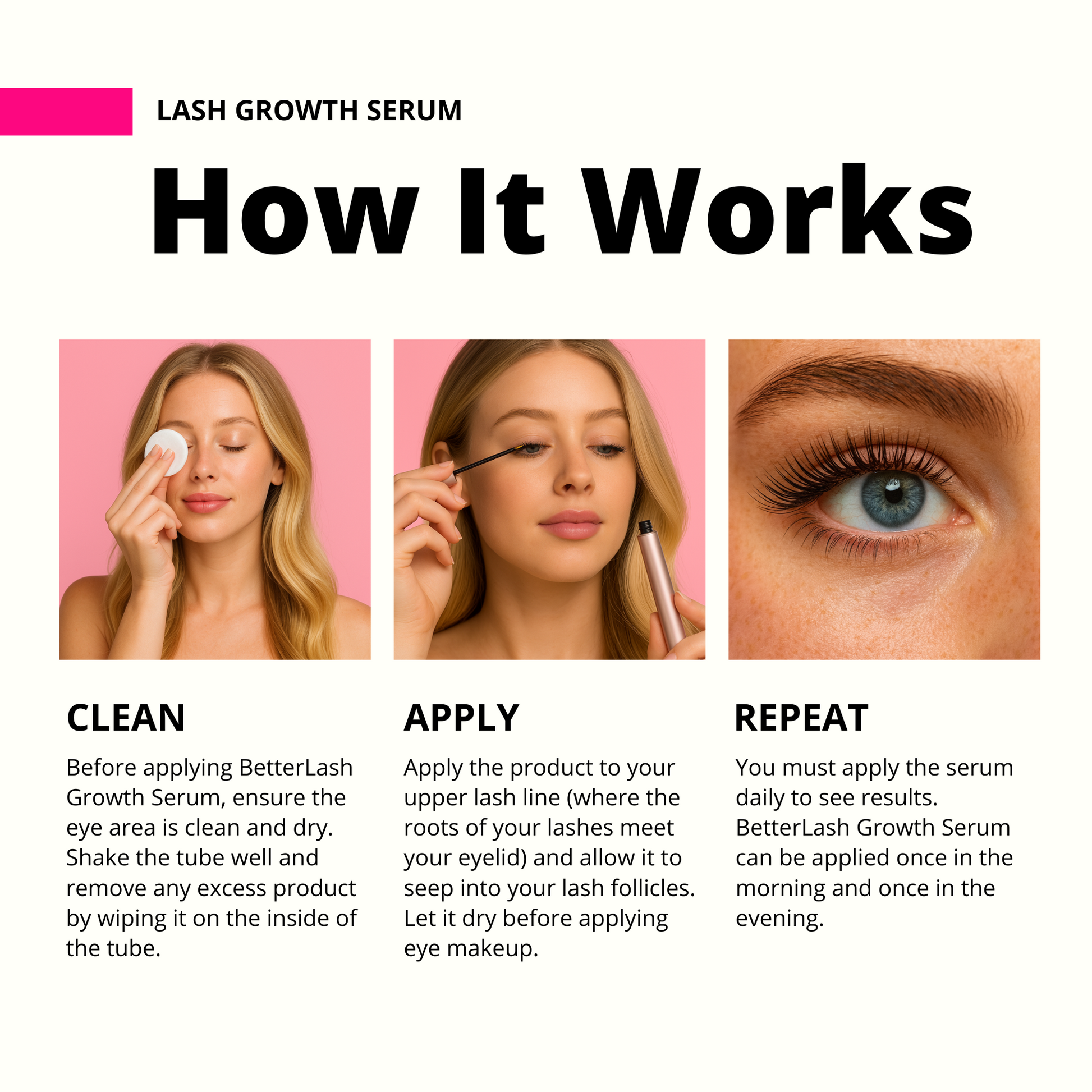 Apply BetterLash Growth Serum once or twice daily for the first 10-12 weeks, then every 2 days for ongoing maintenance.